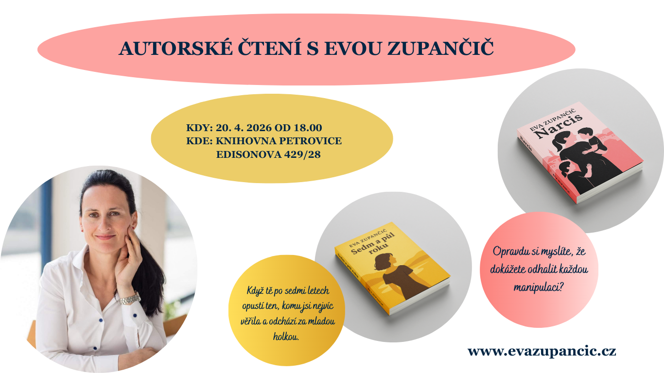 Srdečně vás zveme na autorské čtení a besedu s autorkou Evou Zupančič, které se bude konat v úterý 20. dubna 2026 v Místní knihovně Petrovice. Přijďte si poslechnout úryvky z knih Narcis i Sedm a půl roku, zjistit, jak knihy založené na skutečných příbězích vznikaly a zeptat se na vše, co vás kolem knih a příběhů, které vyprávějí, zajímá.